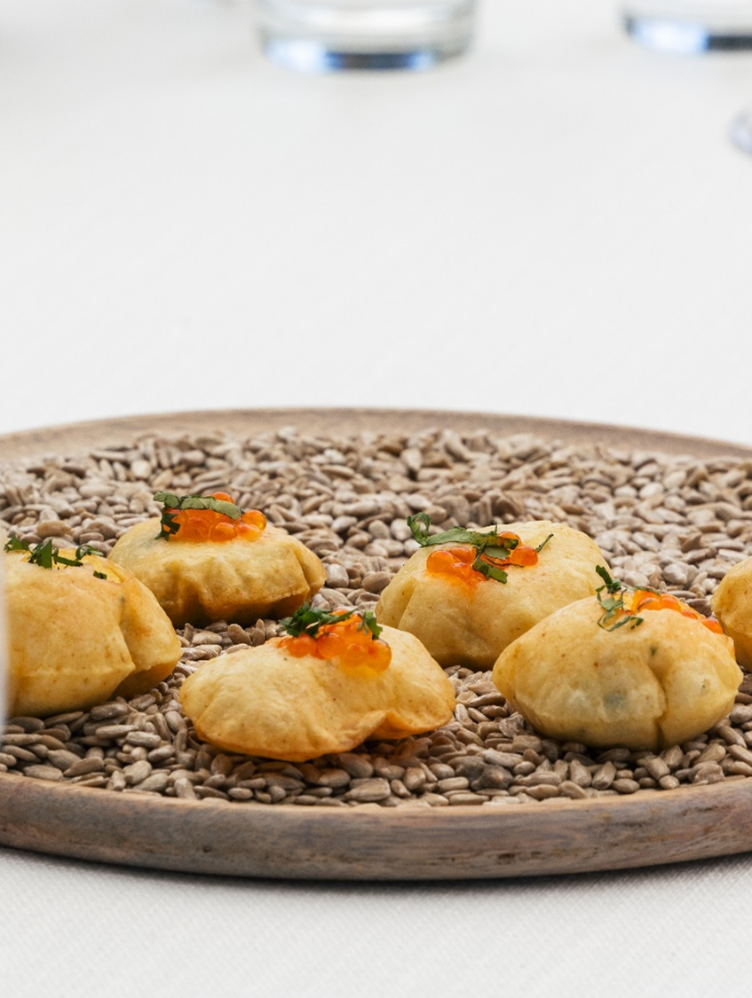 CURRY SPANNER CRAB PURI Salmon roe & dill
